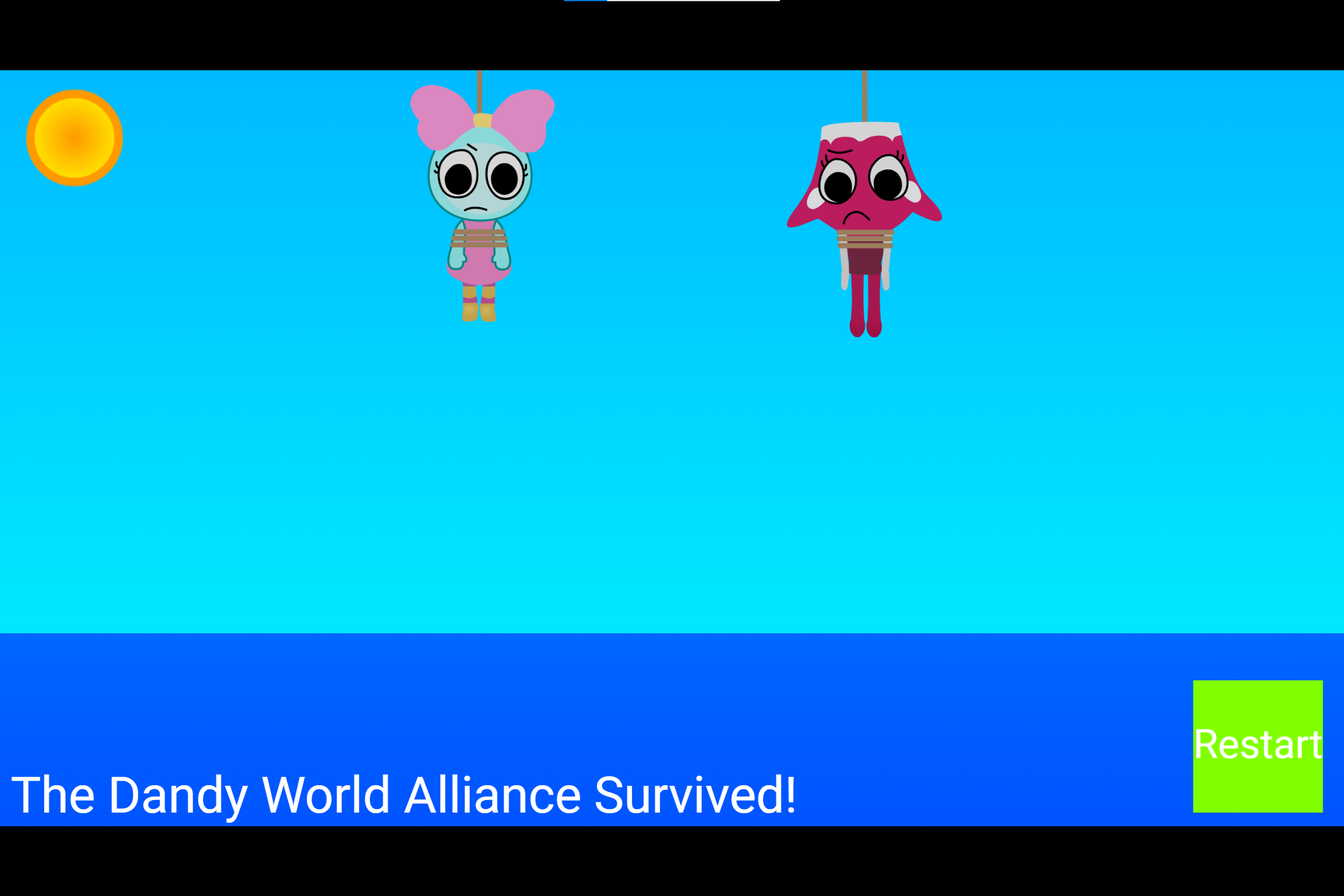 When the game starts, characters take turns to lower a random character or enemy’s rope, when a character is lowered 5 times, the character gets eliminated. Some characters can higher ropes by spells or something else. For characters to survive or the game to end, they must have no enemies tied in searopes or the game must have only one alliance tied in searopes and there are no characters tied in searopes lowering random character’s ropes.